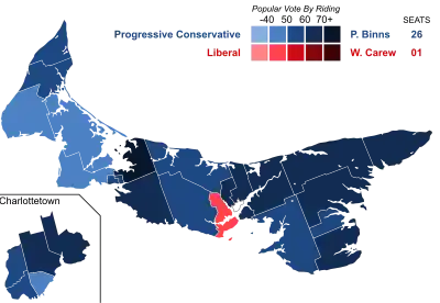 Premier Pat Binns' Progressive Conservative Party was elected to its second straight majority, winning every seat but one. This was an increase of eight seats from the previous election.