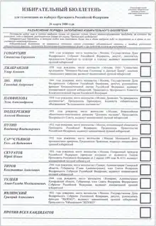 The elections would be held on 26 March 2000, as Russian law required an election to be scheduled three months after the office of president is vacated. Before Yeltsin's resignation, the 2000 presidential election had been expected to be held in June or July.[6][7][8] The Duma had originally passed legislation scheduling the first round of the election for June 4, with a runoff scheduled for June 25 if necessitated.[8][9]
