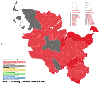 The 2000 Schleswig-Holstein state election was held on 27 February 2000 to elect the members of the Landtag of Schleswig-Holstein. The incumbent coalition government of the Social Democratic Party (SPD) and The Greens led by Minister-President Heide Simonis retained its majority and continued in office.