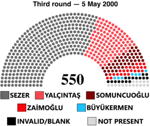 The 2000 Turkish presidential election consisted of a first round election on 27 April 2000 followed by a second round vote on 1 May and a third on 5 May. It occurred at the end of 9th president Süleyman Demirel's seven-year term in office. There was a small effort to convert Turkey's presidential system into two terms of five years each, which would have given Demirel an additional three years, but this proposal never found widespread support.