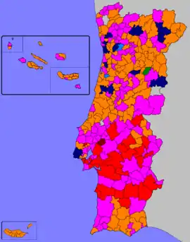 The Social Democratic Party (PSD) won the elections by a landslide, defying polls in many cities across the country in particular the three main cities, Lisbon, Porto and Sintra.[1] The victory of the PSD in these local election was the first since 1985, the last time the PSD won more mayors than the Socialists, although in 1997, the PS and PSD basically tied in number of elected mayors. The PSD won 11 of the 20 district capitals mainly Lisbon, won by Pedro Santana Lopes, and Porto, won by Rui Rio, plus many suburban cities like Sintra, Cascais, Vila Nova de Famalicão and Penafiel swung also to the Social Democrats.
