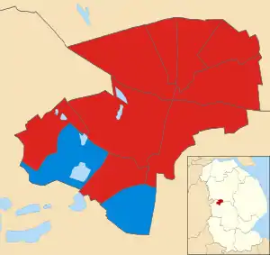 ![]() Map showing the results of the 2002 Lincoln City Council elections by ward. Red shows Labour seats and blue shows Conservative seats. | |||||||||||||||||||||||||