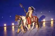The beauty of the Utah landscape was showcased as huge puppets of native Utah animals, including a 15-foot-long bison and the American bald eagle (the national bird and animal of the U.S.), entered the stadium, as well as dancing pioneer settlers as two trains came together on, symbolizing the US railroad industry which was beneficial to Utah's economy beginning in the 1860s, as well as economically linking the Western U.S. and the Eastern U.S. At the end of this segment, the performers unfurled a giant quilt that covered the entire stadium floor with the 2002 Winter Olympics logo in the center.[6] Two figure skaters, Olympians Kristi Yamaguchi, Jozef Sabovcik (the fire within), and Scott Hamilton performed on the oversized ice rink to the song "Gold" by Linda Eder.[7] Other notable skaters included a young local skater and Beatrisa Liang as younger versions of Kristi Yamaguchi's character.