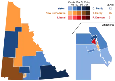 | Yukon Party | Dennis Fentie | 18 | 2 | 12 | +500% | 5650 | 40.3% | |