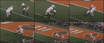 The play in question. Frame two depicts Gamble releasing on his route as Sharpe initiates contact, known as "jamming" the receiver.[16] At frame five, play-by-play announcer Keith Jackson states "That could have been holding there" during the instant replay portion of the television broadcast.[17]
