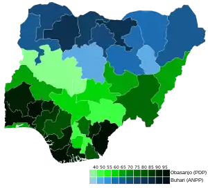 ![]() States won by Obasanjo (in green), and Buhari (blue) | |||||||||||||||||||||||
