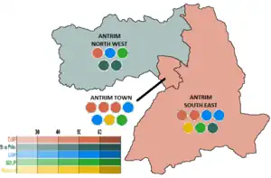 | Antrim South East | 34.6 | 2 | 27.4 | 2 | 20.0 | 1 | 9.0 | 1 | 8.3 | 1 | 0.7 | 0 | 7 |