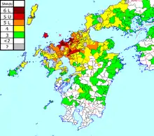 The Fukuoka earthquake (福岡県西方沖地震, Fukuoka-ken Seihō Oki Jishin) struck Fukuoka Prefecture, Japan at 10:53 am JST on March 20, 2005, and lasted for approximately 1 minute. The Japan Meteorological Agency (JMA) measured it as peaking at a magnitude of 7.0, whereas the United States Geological Survey (USGS) reported a magnitude of 6.6.[1] The quake occurred along a previously unknown fault in the Genkai Sea, North of Fukuoka city, and the residents of Genkai Island were forced to evacuate as houses collapsed and landslides occurred in places. Investigations subsequent to the earthquake determined that the new fault was most likely an extension of the known Kego fault that runs through the centre of the city.