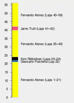 This was another dominant win from Renault, as Fernando Alonso secured his first win of the season from pole position. At the start he led from Jarno Trulli, before finishing the race 20-odd seconds ahead of the Italian, claiming Toyota's first ever podium position.