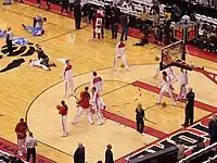 The first half of the season produced mixed results as Toronto struggled towards the .500 mark after a dismal 2–8 start.[8] Bosh's consistent performances however ensured he was named an All-Star starter in the 2007 NBA All-Star Game on 25 January 2007. He received the most votes after LeBron James among all Eastern Conference forwards.[11] A day later, the Raptors hit the .500 mark for the first time since the 2003–04 season after defeating the Boston Celtics at the Air Canada Centre.[12] On 2 February, the Raptors went 24–23, the first time since 2001–02 that they had been over .500 this late in a season.[13] As a result, the Raptors won three NBA Eastern Conference awards for the month of January: Player of the Month (Bosh),[14] Rookie of the Month (Bargnani)[15] and Coach of the Month (Sam Mitchell).[16] On 4 February, the Raptors' 122–110 home win against the Los Angeles Clippers represented a season-high in points for the Raptors.[17] Within the same week, Bosh's career-high 41 points in a win against the Orlando Magic prompted an unheard of event at the Air Canada Centre—chants of "MVP" by the home fans.[18] This chant was repeated in a win against Vince Carter's New Jersey Nets ten days later—to the disbelief of Carter—a game which also saw the team break franchise records for the most home wins and highest home winning percentage entering the All-Star break.[19][20]