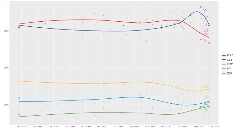 7. "CiU mantiene una ventaja de casi seis puntos y hasta 14 escaños sobre el PSC". La Vanguardia (in Spanish). 26 October 2006.