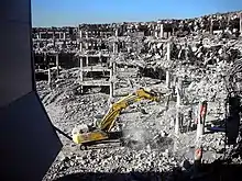 At 08:59 the Renault Trafic went off, destroying much of section D of the parking lot of the airport's newly built Terminal 4 and sending a massive column of smoke into the air. The terminal, designed by Antonio Lamela and Richard Rogers, had been inaugurated just a few months before, on February 5, 2006.[15] According to reports, the van was carrying 500 to 800 kilograms (1,100 to 1,800 lb) of an unknown kind of explosive, probably a mix of ammonium nitrate and hexogen, becoming the third most powerful explosive device ever used by ETA.[16] The explosion demolished almost all of the five floors of the car park and produced around 40,000 tones of debris, with the zone being compared by Spanish authorities to the World Trade Center ground zero,[17] as well as damaging at least 1300 vehicles parked in the terminal. The terminal building was also affected.[16]