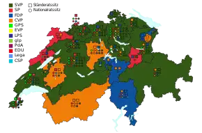 Map of Swiss cantons colored by the party that won the most votes. The seats that were won in the cantons for both the National Council and the Council of States are shown as well.
