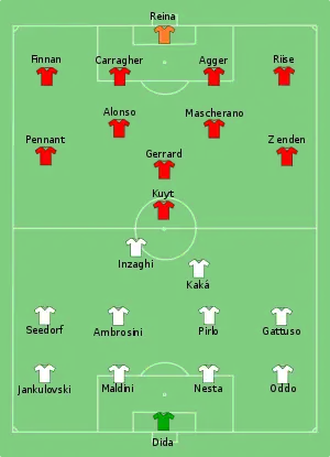 Milan won the toss and Liverpool kicked off.[41] Playing in a 4–2–3–1 formation, Liverpool had the first attack of the match, but Jermaine Pennant could not reach Steven Gerrard's cross-field pass.[29] Milan responded with two low attempts on the Liverpool goal, but Jamie Carragher was able to clear them both. The second clearance led to a corner, from which Milan failed to score.[41] Liverpool had the first chance of the match in the ninth minute. A slip from Milan defender Marek Jankulovski allowed Pennant to run into space, he passed the ball to Dirk Kuyt who passed it back to him, Pennant's subsequent shot was saved by Milan goalkeeper Dida.[41] Minutes later Gerrard won a header which found Pennant, however Gerrard was unable to make decent contact with the ball following Pennant's pass.[29] Milan had their first shot of the match a few minutes later. Kaká received the ball outside the area and moved to his right before shooting, however Liverpool goalkeeper Pepe Reina saved the shot.[29] Liverpool continued to exert pressure leading Milan defender Massimo Oddo to mis-read a cross from Pennant, the ball reached Gerrard whose shot went over the goal.[29]