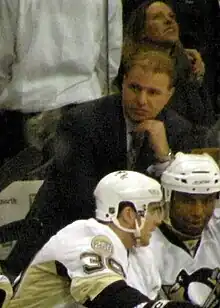 On February 14, Sergei Gonchar made his season debut and Ruslan Fedotenko returned to the line-up after missing over a month due to a hand injury.[55] On February 15—with the Penguins five points out of the playoffs[56]—Therrien was replaced by Dan Bylsma, the coach of the Penguins' AHL affiliate Wilkes-Barre/Scranton, on an interim basis.[57] Tom Fitzgerald was promoted from Director of Player Development to assistant coach for forwards, while Mike Yeo, already with the team, became assistant for the defensemen. Assistant Andre Savard was reassigned within the organization.[58]