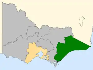 ![]() Gippsland (green) within Victoria. | |||||||||||||||||||||||||||||||||