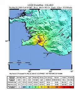 The 2008 Iceland earthquake was a doublet earthquake that struck on May 29 at 15:46 UTC in southwestern Iceland.[2] The recorded magnitudes of the two main quakes were 5.9 Mw and 5.8 Mw , respectively, giving a composite magnitude of 6.1 Mw .[4] There were no human fatalities, but injuries were reported and a number of sheep were killed. The epicenter of the earthquake was between the towns of Hveragerði and Selfoss, about 45 kilometers (28 mi) east-southeast of the capital, Reykjavík. It was the strongest earthquake to hit Iceland since the summer of 2000.[5]