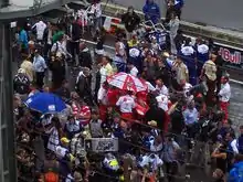 All the riders cruise back to the pits and both Rossi and Lorenzo wave at them as they exit Turn 16, them cheering in return. As Rossi arrives, he steps off his bike and hugs his crew, believing that the race will not be started again due to the dangerous conditions. As all the riders wait for the decision from race control whether or not the race will continue, riders like Hayden get interviewed by American sporting press.