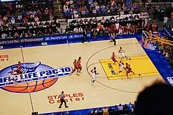 The 2008 Pacific Life Pacific-10 Conference men's basketball tournament was held between March 12 and March 15, 2008, at Staples Center in Los Angeles. All ten schools in the conference qualified for the tournament. Number one seed UCLA defeated number two seed Stanford 67–64 to win the conference tournament. It was the first time since 2005 that the top two seeded teams were in the final game. UCLA was the regular season champion. A record crowd of 18,997 (Staples Center capacity for Basketball) was on hand to watch UCLA defeat USC 57–54 in the semi-finals.[2] On January 3, 2010, USC Athletic Director Mike Garrett announced that the school was to vacate the 2007–08 season's victories for NCAA violations by the basketball team.[3]
