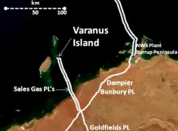 Since 1996, Varanus Island, 70 kilometres (43 mi) from the Western Australian coast, has operated as a hub for oil, condensate and gas gathering infrastructure belonging to several petroleum joint ventures, including Harriet JV and John Brookes JV. The island's facilities include large tanks where condensate is stored prior to being offloaded onto tankers, and five gas plants. Condensate, water and other impurities are removed from the gas arriving from the offshore platforms connected to the island. Most of the carbon dioxide is removed so the gas can meet the specifications of the onshore pipelines and end users.[1] Gas from the plant is sent via two subsea pipelines to the mainland, where the pipelines connect to the Goldfields Gas Pipeline and the Dampier to Bunbury Natural Gas Pipeline.[2] Before the incident, the plant produced 365 terajoules of gas per day for the state market.[3]