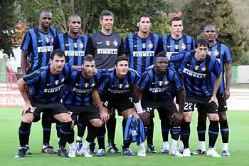 The main transfer move was an exchange with Barcelona, as Zlatan Ibrahimović and Samuel Eto'o swapped clubs.[2] From a tactical point of view, the line-up was not made up from this fact: Eto'o was himself a centre-forward.[3] His partner was Diego Milito, acquired from Genoa, like the midfielder Thiago Motta.[4] There were also the arrivals of the centre-back Lúcio and the playmaker Wesley Sneijder.[5] Inter unveiled the season losing the Supercoppa Italiana, due to a 2–1 knockout against Lazio.[6]