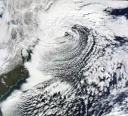 Near the end of the month, another blizzard struck parts of New England, New York, New Jersey, and Pennsylvania. This storm was a complex combination of multiple systems, including an upper air low from the northern Great Plains states, and a surface low from the Gulf Coast states. As the surface low tracked northeast from the coast of North Carolina, the upper air low transferred its energy to it, eventually enabling the new storm to undergo rapid intensification near the shore of eastern Long Island. A strong blocking regime of high pressure over the Canadian Maritime provinces prevented the storm system from exiting to the east. This resulted in a cutoff low (not influenced by the predominant jet stream currents), which took a highly unusual track, retrograding west into New York state before looping back out to sea.[14] Total snowfall accumulations were as high as 36 inches (91 cm) in areas further inland, while New York City picked up 20.9 inches of snow.