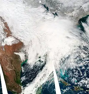 On December 16, meteorologists identified a storm forming in the Gulf of Mexico.[4] It produced record rainfall in regions of Texas and had the potential to strengthen as it moved through Georgia and Florida and further north. Weather models accurately predicted that this storm would meet with cold air while retaining its heavy precipitation.[5] By the afternoon of December 19, the large, low pressure region had moved off the East coast, intensifying and bringing heavy snow to the major Mid-Atlantic cities.[6][7] Blizzard warnings were issued in Washington, D.C., Baltimore, and Long Island.[5] As the storm moved northward along the East coast, at one point it measured 500 miles (800 km) across 14 states.[8] The storm produced whiteout conditions and dumped about 16–20 inches (41–51 cm) of snow in major cities along the Eastern seaboard.[9]