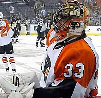 The worst injury, however, was to goaltender Ray Emery, who suffered an abdominal tear and went out of the line-up in early December.[17] A short return came in late January but Emery reinjured and had to undergo hip-surgery ending his season in early March.[18] After continuing the slump with Boucher in net, the Flyers picked up Michael Leighton from waivers, who had fallen out of favor with the Carolina Hurricanes with a goals against average (GAA) above 4.00 and a save percentage below .850.[19] However, Leighton would turn his season around with the Flyers with an 8–0–1 record in ten consecutive starts after he had been picked up.[20] His season too would end early with a 16–5–2 record after suffering a high ankle sprain in a game against Nashville on March 16.[21]