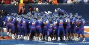 The 2009 Boise State Broncos football team represented Boise State University in the 2009 NCAA Division I FBS football season. The Broncos played their home games at Bronco Stadium, most famous for its blue artificial turf surface, often referred to as the "smurf-turf". They completed the regular season undefeated (13–0), their second consecutive unbeaten regular season and fourth in the last six years (2004, 2006, 2008, 2009), and won the WAC title for the seventh time in the last eight years. The Broncos capped their season with a showdown against fellow unbeaten TCU in the 2010 Fiesta Bowl, which marked the Broncos' return to the site of the game that put the program on the national sports map, the 2007 Fiesta Bowl. With their 17–10 win, the Broncos avenged a loss to the Horned Frogs in the previous season's Poinsettia Bowl, and became only the second team in Division I FBS history to finish a season 14–0, after Ohio State in 2002 (Alabama became the third team to go 14–0 just three days after the Fiesta Bowl). The Broncos finished ranked #4 in the Associated Press and USA Today coaches poll for their highest ranking in school history to finish a season.
