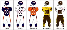 - 1 2 These two games were among the 16 that the NFL designated as "AFL Legacy Games," in honor of the 50th anniversary of the AFL. The Broncos wore their throwback uniforms during those two games, as did the Patriots and Chargers. The Broncos wore the yellow jerseys (with brown numerals) against the Patriots, and the white jerseys (with brown numerals) at the Chargers.[6]