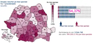 Both runoff candidates declared themselves winners after tight exit polls.[30][31] On Monday, 7 December 2009 at 8 am, BEC published the first official partial results, after having counted the votes from 95.4% of the total of 21706 poll stations. According to these partial results, Traian Băsescu had achieved 50.43% of the total eligible votes, while Mircea Geoană got the rest of 49.57%.[32] The official partial results tallied at 10:16 am (Monday, 7 December 2009) attested that Traian Băsescu achieved 50.37% of the total eligible votes and Mircea Geoană 49.62%.[33] A majority of 79% the votes from abroad, fully counted in this tally, went for Băsescu (115,831 to 31,045).[1][34] Some 94% of the estimated 200,000 Moldovans with Romanian citizenship who voted in the election cast their vote for Băsescu, who has been a vocal advocate of Moldovans' right to regain Romanian citizenship.[35] Following final results, Sibiu mayor Klaus Iohannis announced that he is abandoning his bid to become prime minister in the current situation.[36] Romanian stock markets fell to a four-month low after the official results were announced, deepening a political crisis that threatens ties with international lenders.[37]