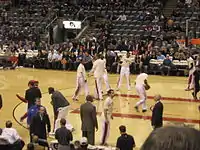 Before the 2010–11 season began, there was much anticipation around the league over the fates of an elite pack of free agents, featuring the likes of Raptors franchise player Chris Bosh, Dwyane Wade, LeBron James, and Amar'e Stoudemire. Bosh and James eventually chose to converge in Miami with Wade, and the sign and trade transaction that ensued resulted in the Raptors receiving two first-round draft picks and a trade exception from Miami.[1] Prior to this, Toronto had drafted Ed Davis, also a left-handed power forward like Bosh, acquired Solomon Alabi from the Dallas Mavericks, and picked up Joey Dorsey. Amir Johnson was signed to a new deal, and Linas Kleiza was made an offer sheet that Denver later refused to match.[2] After Bosh left, General Manager Bryan Colangelo sought to trade Reggie Evans, José Calderón—the last remaining Raptor from the pre-Colangelo days—and the disenchanted Hedo Türkoğlu to the Charlotte Bobcats for Tyson Chandler, Boris Diaw, Leandro Barbosa and Dwayne Jones.[3] Barbosa was drafted by Colangelo when the latter was still with the Phoenix Suns, and Diaw played there during Colangelo's tenure too. However, the trade involving Chandler/Diaw/Evans/Calderón fell apart at the last minute when Chandler was traded to Dallas instead.[4] A sign-and-trade involving Orlando's Matt Barnes was also in the works, but ran into last-minute difficulties as well.[5] In the coaching department, P. J. Carlesimo joined the team of assistant coaches, while Marc Iavaroni left for the Los Angeles Clippers.[2]