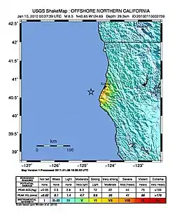 The 2010 Eureka earthquake occurred on January 9 at 4:27:38 pm PST offshore of Humboldt County, California, United States. The magnitude was measured 6.5 on the Mw scale, and its epicenter was located offshore in the Pacific Ocean 33 miles (53 km) west of the nearest major city, Eureka.[1][6][7][8] Additionally, there was a separate earthquake further offshore of Eureka on February 4 with a slightly lower magnitude of 5.9.[9] It was also the most significant earthquake in the Eureka area in terms of magnitude since the 1992 Cape Mendocino earthquakes.[10] It was felt from Santa Cruz County, California in the south, to Eugene, Oregon in the north and to the east as far as Reno, Nevada.[7]