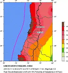 The 2010 Pichilemu earthquakes (Spanish: Terremoto de Pichilemu de 2010), also known as the Libertador O'Higgins earthquakes, were a pair of intraplate earthquakes measuring 6.9 and 7.0 Mw that struck Chile's O'Higgins Region on 11 March 2010 about 16 minutes apart. The earthquakes were centred 15 kilometres (9.3 mi) northwest of the city of Pichilemu.[2]