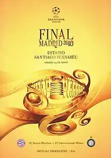 The 2010 UEFA Champions League final was an association football match played at the Santiago Bernabéu Stadium, home of Real Madrid,[4] on 22 May 2010, to determine the winners of the 2009–10 UEFA Champions League. It was the first Champions League final to be played on a weekend, rather than the traditional weekday.[5] The match was won by Inter Milan, who beat Bayern Munich 2–0 to complete the treble, a feat never before achieved by any team from either Italy or Germany. The refereeing team came from England and was led by Howard Webb.[2]