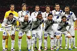 Inter Milan players line up before facing CSKA Moscow in the UEFA Champions League, 27 September 2011