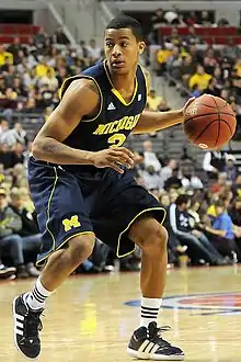 Before the season began, point guard Darius Morris, the Big Ten assists leader in the 2010–11 season, left the team after being drafted by the Los Angeles Lakers.[5] The incoming class included Carlton Brundidge and 2011 Ohio Mr. Basketball point guard Trey Burke.[6][7][8] Both Brundidge and Burke were among Scout.com's top 100 players of the 2011 class; Brundidge ranked 98th and Burke ranked 94th.[9] Max Bielfeldt committed to Michigan in April despite his family's ties to the Illinois Fighting Illini. Illinois University's Bielfeldt Athletic Administration Building was endowed by his family.[10][11] Sai Tummala, who along with Bielfeldt was recruited by Ivy League schools, rounded out the incoming class. Tummala earned an academic scholarship and was considered a walk-on candidate for the basketball team.[12]