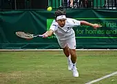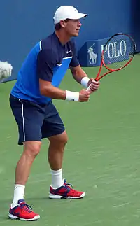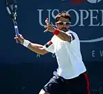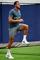 Jo-Wilfried Tsonga started the year having missed much of the end of the 2010 season because of injury.[56] He reached the third round of the Australian Open[56] and made his first final since October 2009 at the World Tennis Tournament in Rotterdam, where he lost to Robin Söderling 3–6, 6–3, 3–6.[57] In May, he dropped out of the top 20 for the first time since January 2008.[58] Tsonga then made his first grass-court final at the Aegon Championships in London, where he was defeated by Andy Murray, 6–3, 6–7, 4–6.[41] He carried this form into Wimbledon, reaching the semifinals. He came from two sets to love behind to defeat Roger Federer in the quarterfinals, 3–6, 6–7, 6–4, 6–4, 6–4.[48] At the US Open, he faced another quarterfinal against Federer, but this time was defeated. He then won two titles: his first in two years at the Open de Moselle over Ivan Ljubičić, 6–3, 6–7, 6–3[59] and the Erste Bank Open, this time defeating Juan Martín del Potro, 6–7, 6–3, 6–4, in the final.[60] Jo also made the final of the 2011 BNP Paribas Masters in November for the second time, after winning in 2008. However, this time he was defeated by Roger Federer 1–6, 6–7. Tsonga was competing for the second time, having previously competed in 2008.[1]