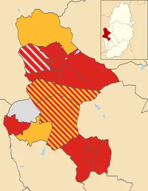 The results had Labour gain 15 seats to win a majority on the council with 24 of the 33 seats.[5] Both the independents and Liberal Democrats lost 7 seats, to fall to 3 and 6 seats respectively.[5] Meanwhile, the only Conservative councillor, John Dymock, lost his seat in Hucknall North.[5] Overall turnout in the election was slightly under 39%.[3]