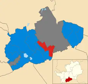 The Conservatives gained Bushey North and Bushey St James from the Liberal Democrats, while the Liberal Democrat leader came third in Bushey Heath.[8] Labour candidate Richard Butler gained Borehamwood Kenilworth from the Conservatives, at the same election that his father Ernie Butler held Borehamwood Cowley Hill for Labour.[4] The gain by 25-year-old Richard Butler meant Labour finished the election with more councillors than before the election for the first time since 1996.[9]