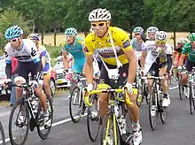 The opening stage's uphill finish of Mont des Alouettes was won by Philippe Gilbert, who took the first yellow jersey as leader of the general classification. He also led the points and mountains classifications.[42] Garmin–Cervélo were the fastest in the 23.0 km (14 mi) team time trial on the second stage, four seconds ahead of second-placed BMC Racing Team. This put Garmin's Thor Hushovd, who was third in stage one, into the yellow jersey.[43] Tyler Farrar won the third stage from a bunch finish. José Joaquín Rojas of Movistar Team, third on the stage, took points classification's green jersey.[44] The following day, a five-rider breakaway group had led the stage after 9 km (6 mi), before the peloton caught on them at the foot of the Mûr-de-Bretagne climb. After a series of attacks, a group of nine riders moved clear, and Cadel Evans won the subsequent sprint finish. Evans took the polka dot jersey as leader of the mountains classification.[45] Mark Cavendish won stage five from a bunch sprint, with second-placed Gilbert taking the green jersey.[46] The sixth stage was won by Team Sky's Edvald Boasson Hagen, who won the hilly bunch sprint in Lisieux. Johnny Hoogerland (Vacansoleil–DCM) took the polka dot jersey.[47]