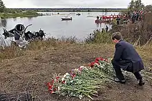 2011 Lokomotiv Yaroslavl plane crash: Russian President Dmitry Medvedev lays flowers in front of the remains of the rear stabilizer of the Yak-42 that carried the Lokomotiv Yaroslavl hockey squad.
