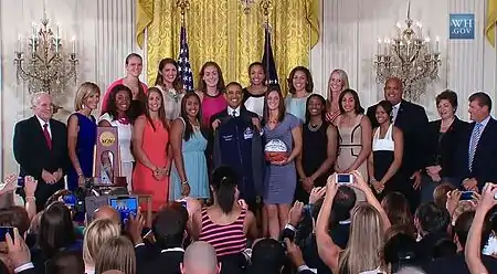 Connecticut's season ended with a win in the championship game of the NCAA tournament, giving the Huskies and Auriemma their eighth title overall. Per tradition, the team was invited to the White House for a meeting with the President. In his remarks, President Obama described the team as "one of the great sports dynasties of our time."[4]