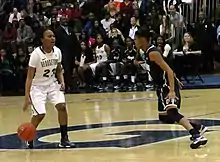 A few days after ascending to the number one ranking, UConn played Notre Dame, a team that had beaten UConn four of the last times they have met, including twice in the Final Four. The game came down to the final shot, but Kaleena Mosqueda-Lewis missed a three-point shot near the end of the game, and Notre Dame held on to win 73–72.[53]