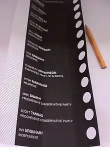 - ↑ "Voters to elect Senate nominees in upcoming election". Global Edmonton. March 26, 2012. Archived from the original on March 27, 2012. Retrieved March 26, 2012.