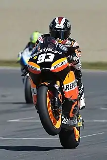 Marc Márquez, doing a wheelie to celebrate winning the Moto2 race.
