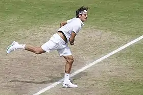 Federer finished his grass court season at the Wimbledon Championships, where he was the third seed and a six-time champion. He was bidding to equal Pete Sampras' record of seven Wimbledon titles won. Federer faced Spaniard Albert Ramos in the first round, and swept past him in less than an hour and a half, dropping only three games en route to his straight sets victory.[47] He next played Italian Fabio Fognini, and dispatched him in similar fashion, winning in straight sets after losing only six games.[48] The match was attended by the Prince of Wales and the Duchess of Cornwall (Charles and Camilla), both of whom met Federer following his win.[49] In the third round, Federer faced Frenchman Julien Benneteau, whom he had lost to in their last encounter at the 2009 Paris Masters. He found himself down two sets to love after Benneteau's brilliant play won a break point in the first set and a tiebreak in the second set. However, Federer steeled himself and won the third set in less than half an hour. He then held off a comeback by Benneteau in a fourth-set tiebreak to level the match at two sets all. Federer broke Benneteau in the fifth set and held his lead to close the match out in three and a half hours.[50] Federer's win over Benneteau marked the second time in the season and the eighth time in Federer's career that he came back from two sets down to win the match. Federer played Belgian Xavier Malisse in the fourth round, and recorded his 850th match win over four sets. Federer was down a break in the first set but broke Malisse back to force a tiebreak, which he won handily. After dropping only one game en route to winning the second set. Federer found his serve broken in the third set, which allowed Malisse to take a set off of Federer. Federer then broke Malisse in the middle of the fourth set to secure the lead, which he held to win the match in just over two hours.[51] He faced Mikhail Youzhny, whom he has an undefeated record against, in the quarterfinals. In a match attended by The Duke and Duchess of Cambridge, Rod Laver, and Andre Agassi and his wife Steffi Graf, Federer steamrollered over Youzhny in just over one and a half hours, dropping only five games in his victory.[52]