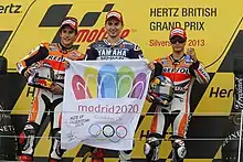 Marc Márquez, Jorge Lorenzo and Dani Pedrosa, celebrating on the podium after finishing second, first and third in the MotoGP race. They are holding a banner that endorses the candidacy of Madrid to host the 2020 Summer Olympics.
