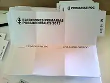 ![]() Claudio Orrego (PDC) | ![]() PDC primary ballot. A primary was held on 19 January 2013 to determine the Christian Democratic Party's pre-candidate for the presidency. This primary was organized by the party and not under the new primary law. The contenders were Claudio Orrego and Ximena Rincón. Orrego won the primary with 59% of the vote.[17]
