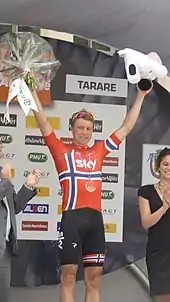 The winner of the stage, Edvald Boasson Hagen of Team Sky, on the podium in Tarare.